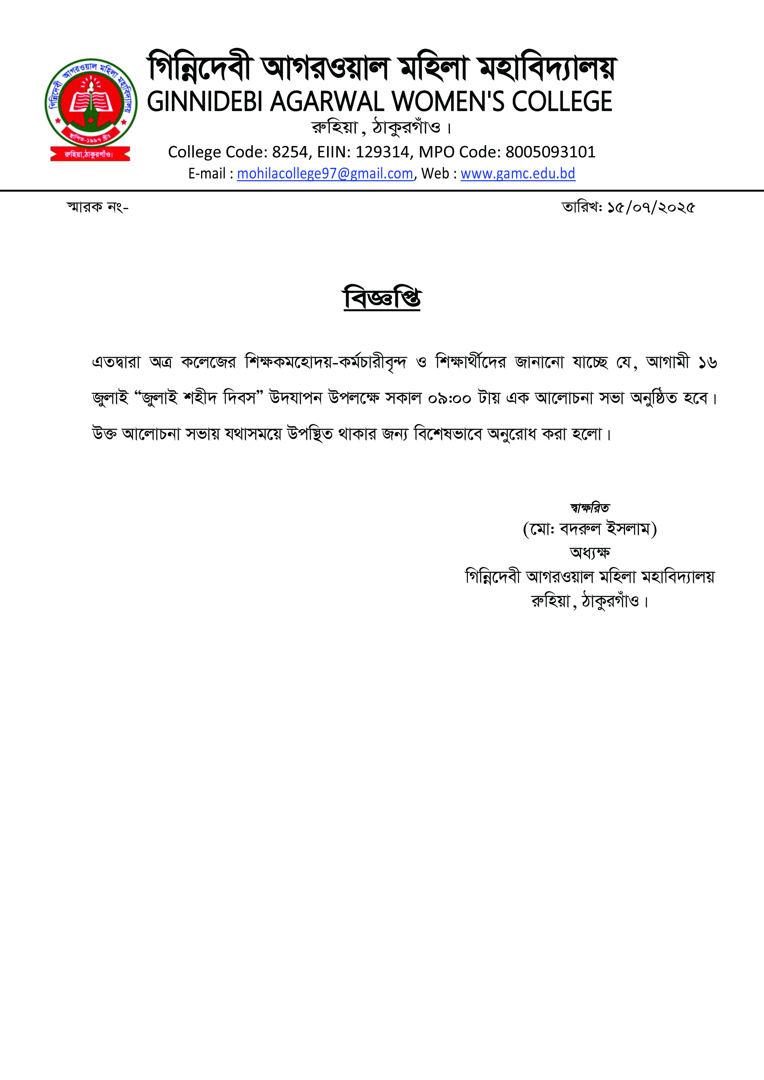 আখেরি চাহার সোম্বা উপলক্ষে কলেজের সকল ক্লাস বন্ধ সংক্রান্ত বিজ্ঞপ্তি